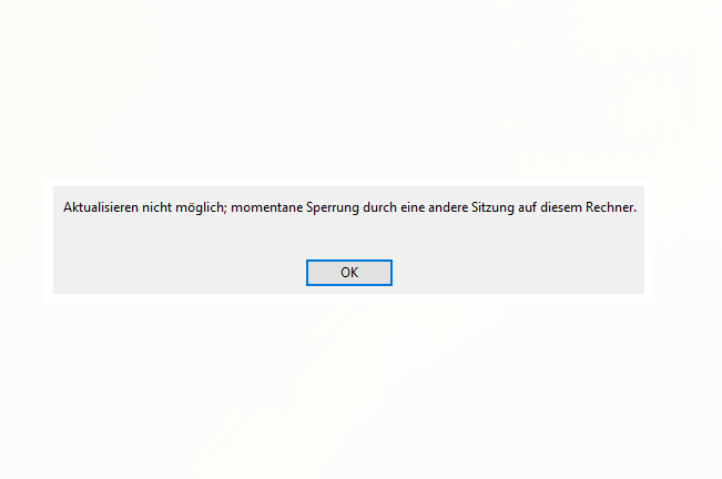 Beim Speichern erscheint plötzlich folgende Fehlermeldung, obwohl vorher immer alles funktioniert hat: „Aktualisieren nicht möglich; momentane Sperrung durch eine andere Sitzung auf dem Rechner“