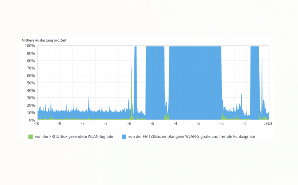 Ein Blick in die Funkkanal-Belegung der FritzBox zeigte, dass 100% Störsignale im 2,4 GHz-Band vorhanden sind: